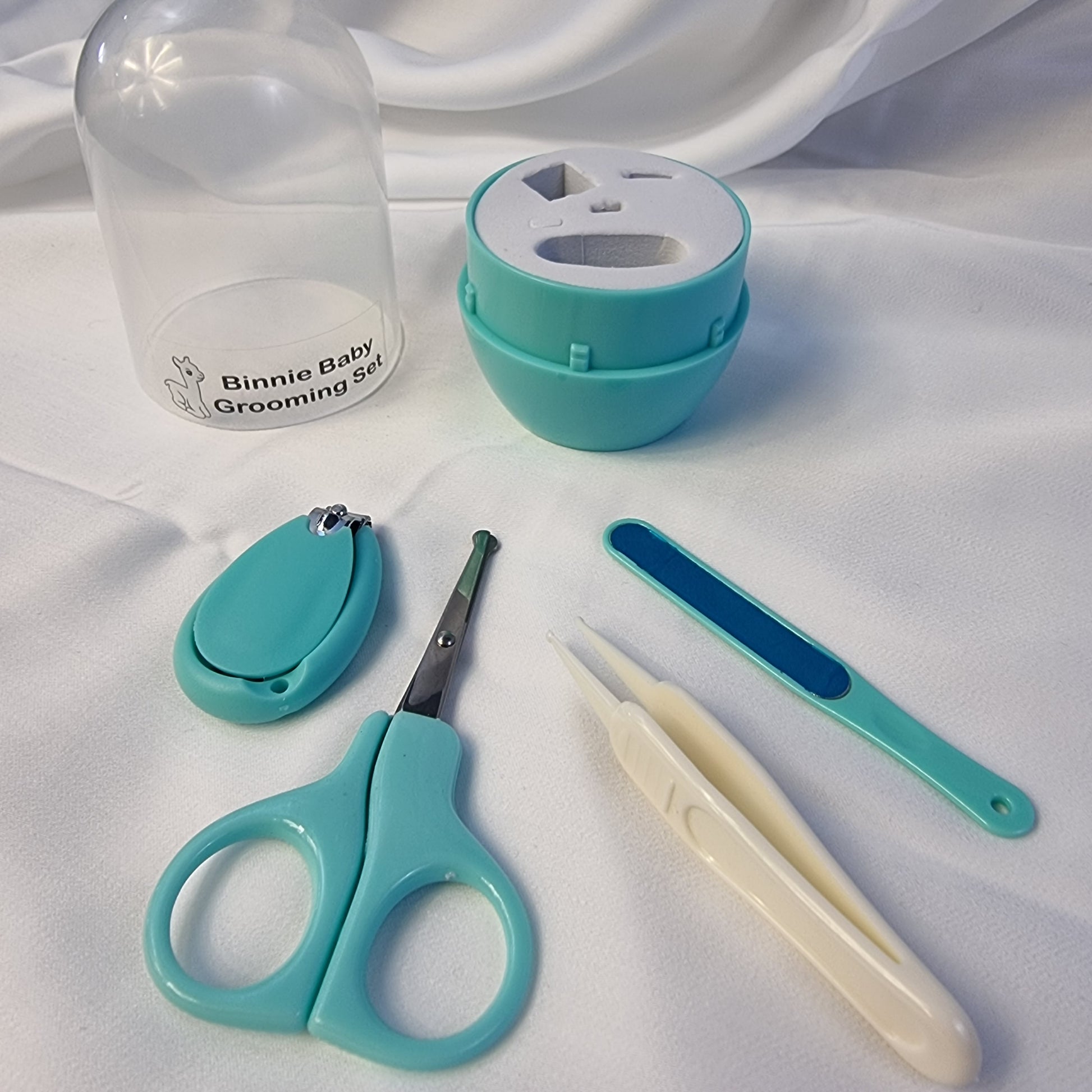 Binnie Baby unique baby grooming set in an Aqua capsule holding 4 essentials to aid in baby health - Safety Nail File/board, Baby Safe Scissors, Tweezers, and Baby Safe Nail Clippers. Great health set for just the essentials.
