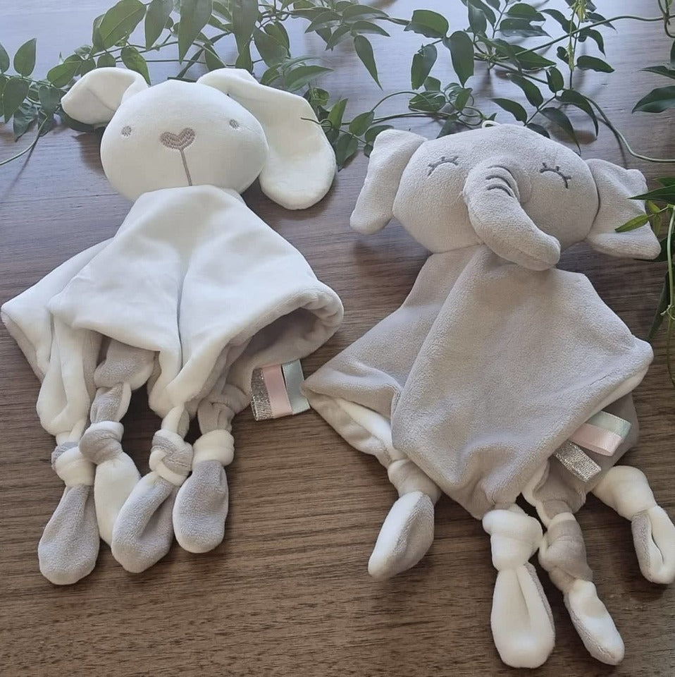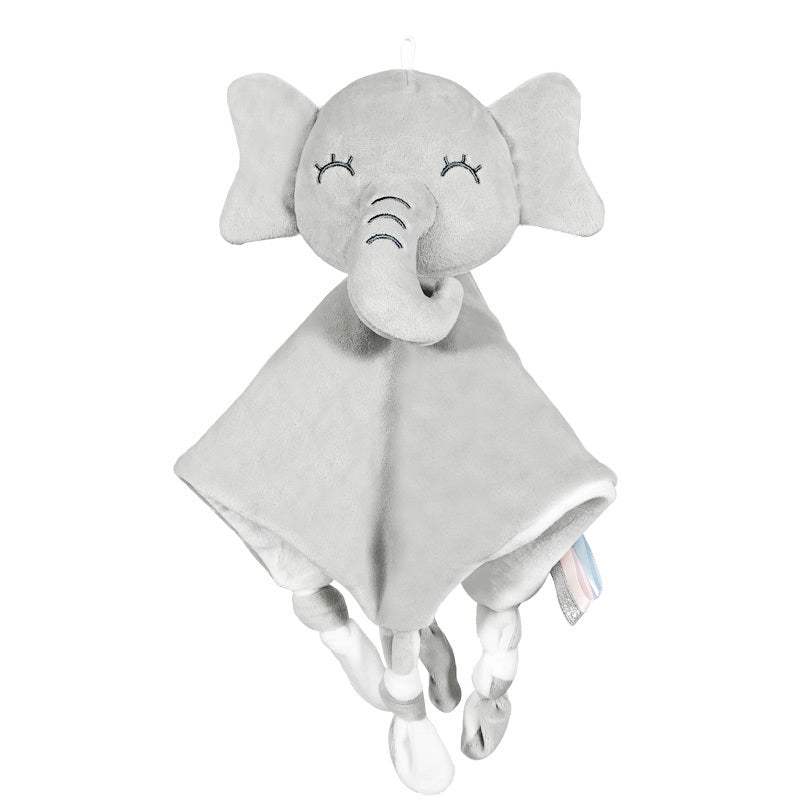 This cute elephant blankie has a light rattle head, fun crinkly sounding ears and is super soft and snuggly! There are some looped ribbons on one side for extra texture.