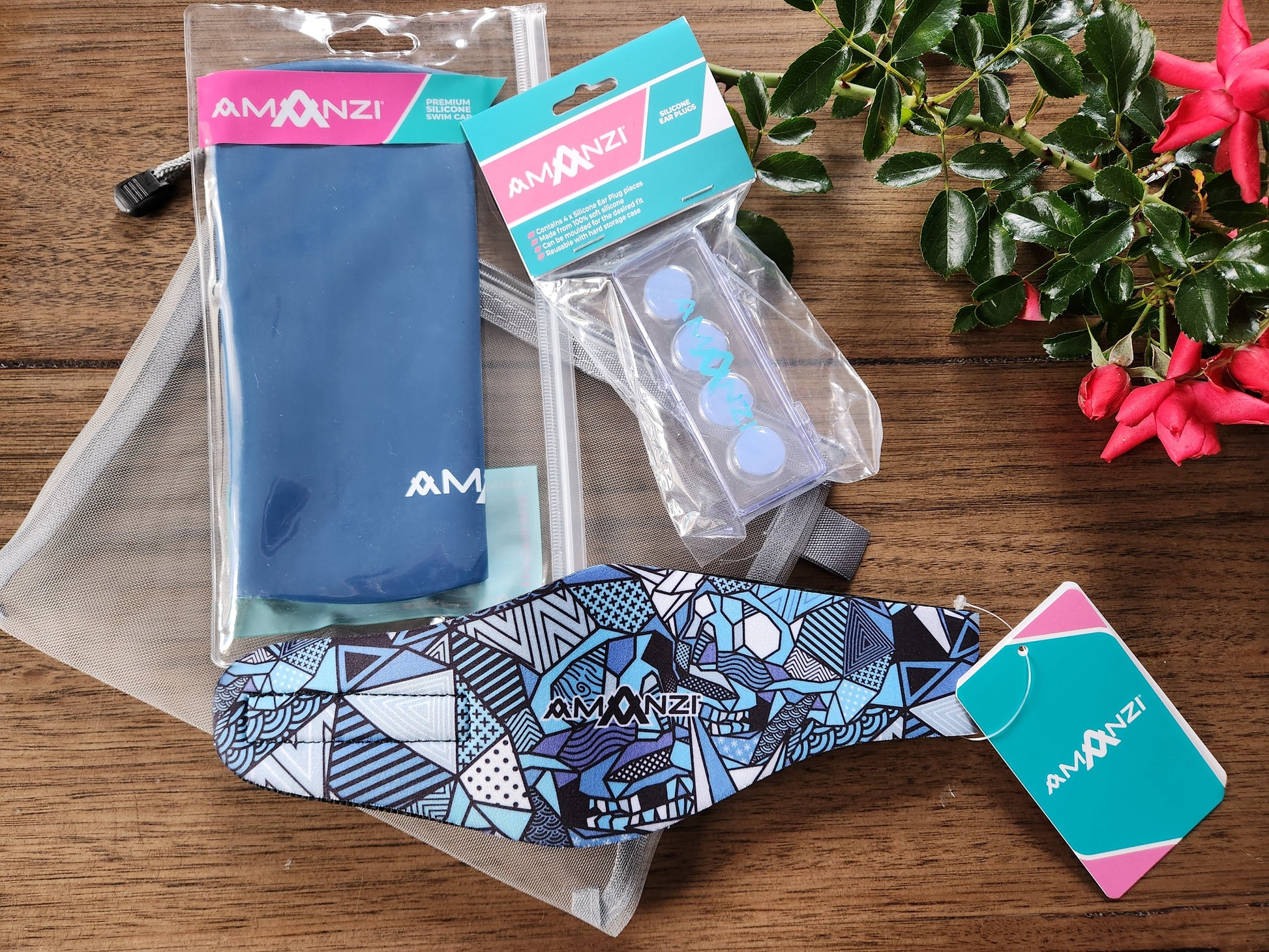 This mega swim kit has everything you need to protect your ears when swimming: a 4-pack of blue swim ear plugs (grommets), an adjustable velcro Amanzi Blue star ear band, a blue silicone swim cap and a handy mesh zip bag. These ear bands are 'one-size fits most' and can be used from infant to adult.