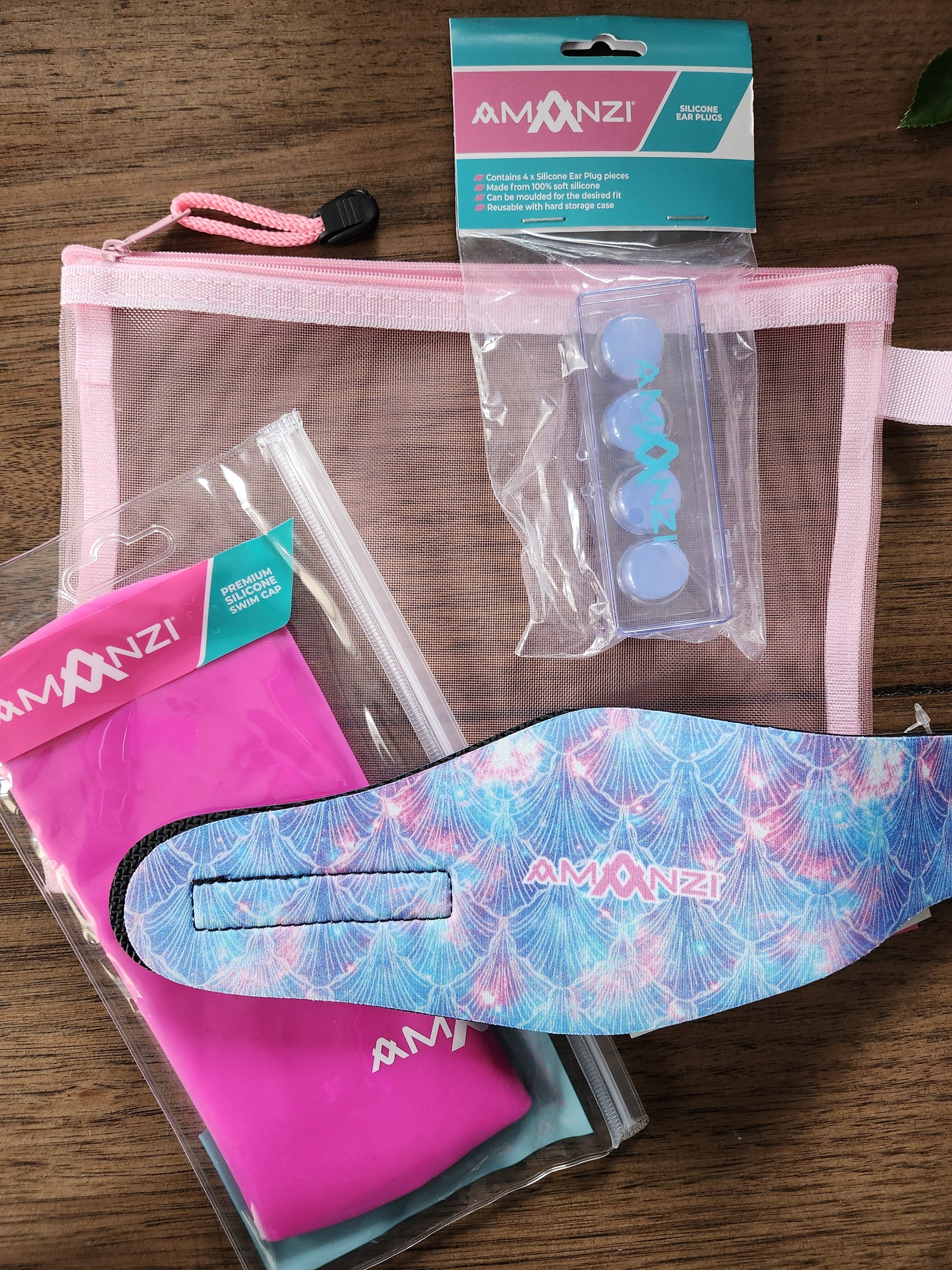 This mega swim kit has everything you need to protect your ears when swimming: a 4-pack of blue swim ear plugs (grommets), an adjustable velcro Amanzi Flutter ear band, a pink silicone swim cap and a handy pink mesh zip bag. These ear bands are 'one-size fits most' and can be used from infant to adult.
