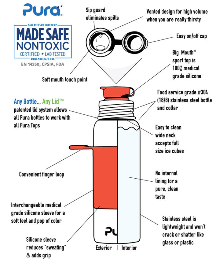 - Zero Plastic… Zero Yuck™: Bottle and collar crafted from safe, anti-bacterial, 18/8 stainless steel and medical-grade silicone Pura Silicone Big Mouth® sport top crafted from 100% medical grade silicone