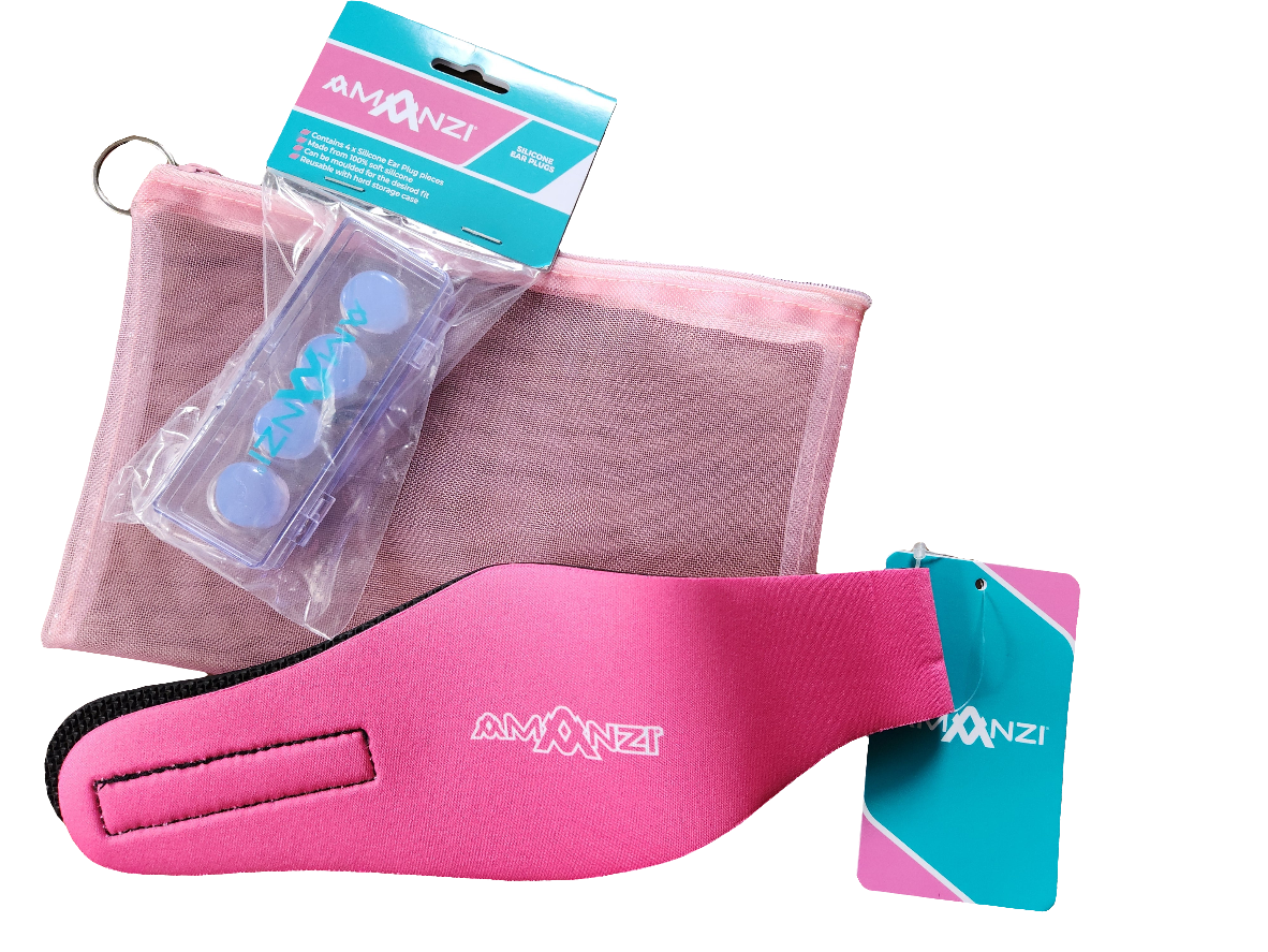 This swim kit has everything you need to make a splash in the pool: a 4-pack of blue swim ear plugs (grommets), an adjustable velcro pink Amanzi ear band, plus a handy pink mesh zip bag. These ear bands are 'one-size fits most' and can be used from infant to adult.
