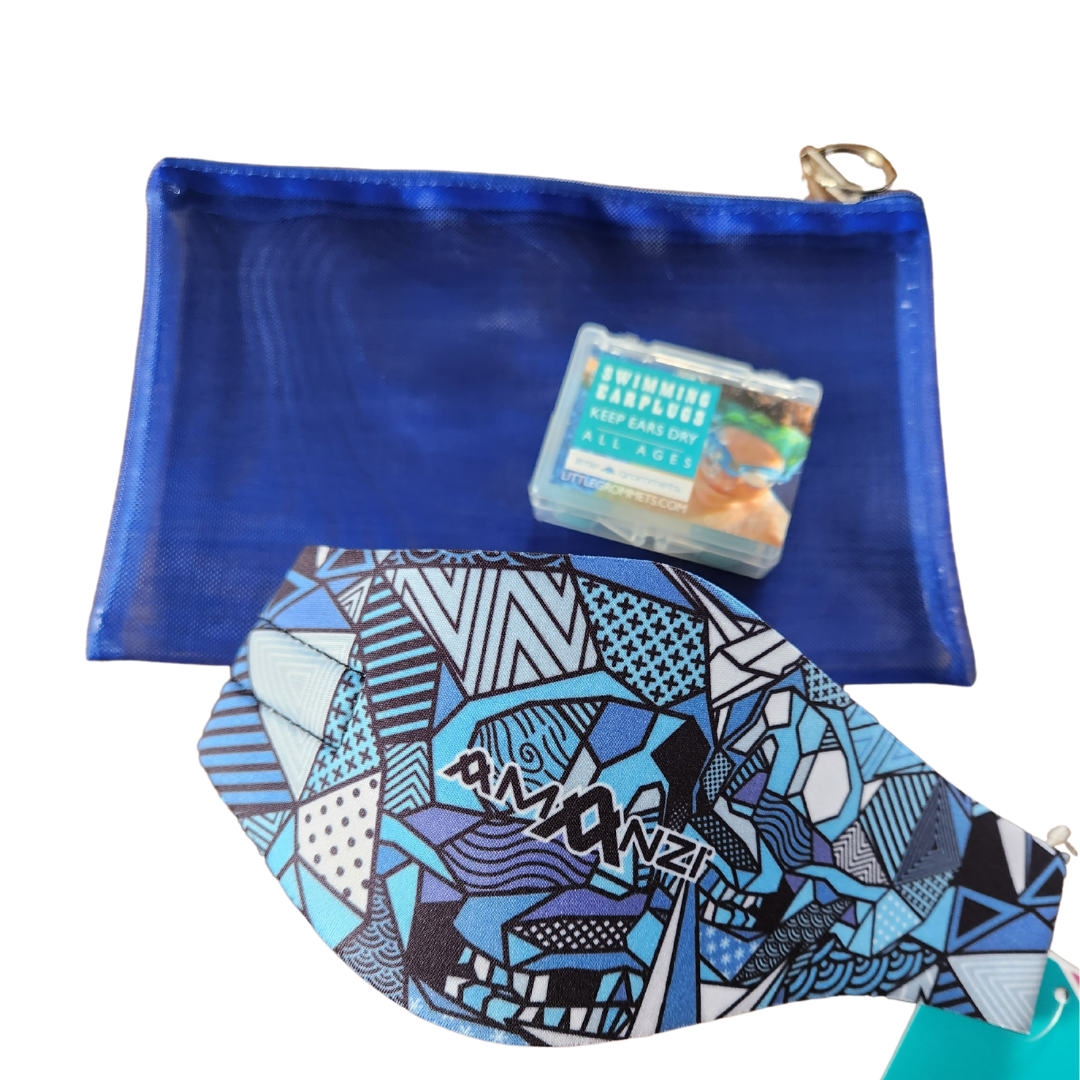 Grab this full swim kit, including a wet-friendly Mesh Backpack (blue), an Amanzi ear band (either Arctic OR Death Star designs), a 4-pack of blue ear plugs, and a small blue mesh zip pouch to guard your gear. Please note that the towel in the image is not included.